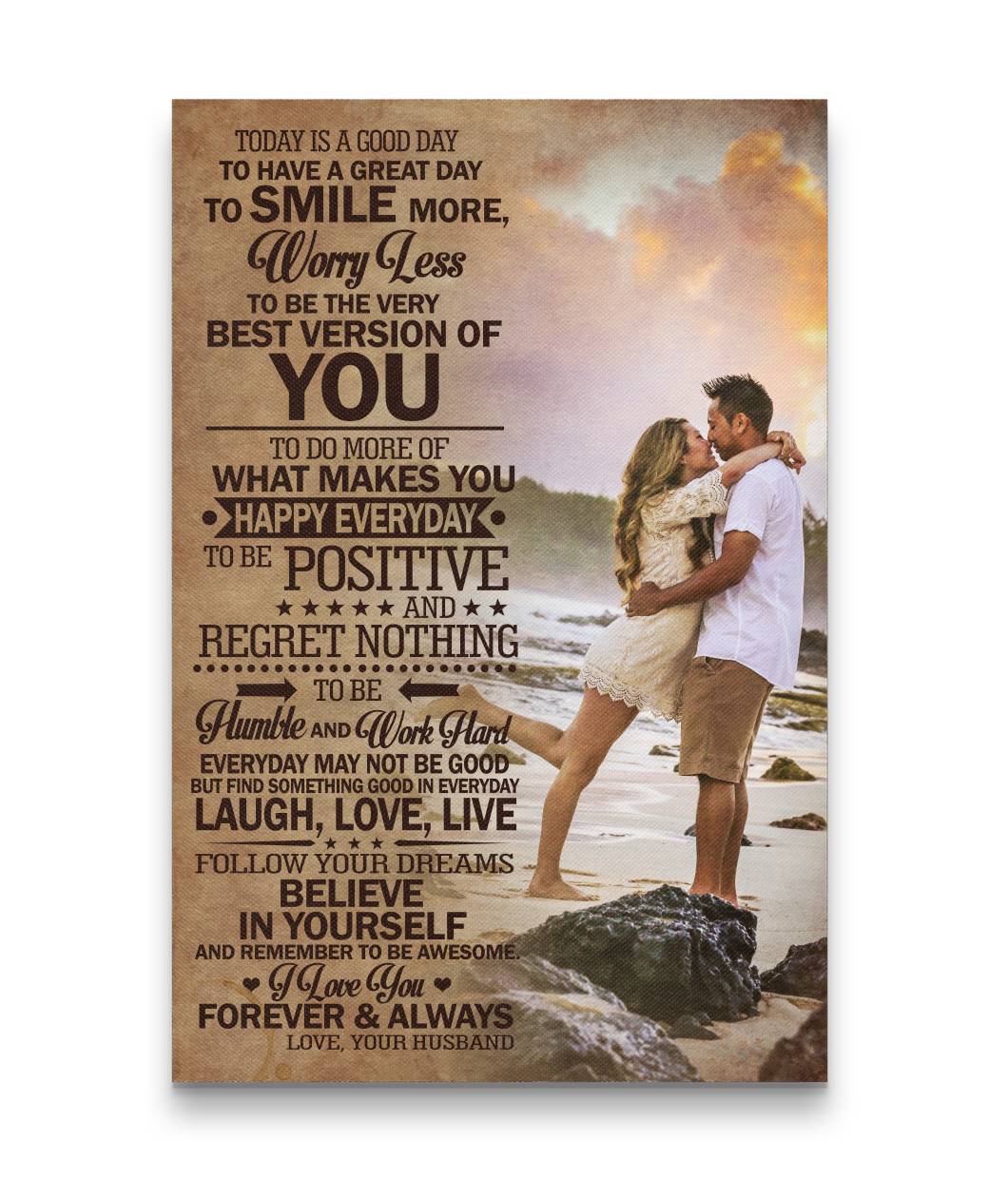 Today Is A Good Day - To Have A Great Day - To Smile More, Worry Less - To Be The Very Best Version Of You - To Do More Of What Makes You Happy Everyday - To Be Positive And Regret Nothing - To Be Humble And Work Hard - Everyday May Not Be Good But Find Something Good In Everyday - Laugh, Love, Live - Follow Your Dreams - Believe In Yourself - And Remember To Be Awesome - I Love You Forever & Always - Love, your Husband Sweet Couple Custom Canvas Prints